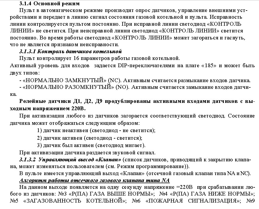 Дело в том, что отсечной клапан на вводе в котельню установили без проекта-NA 12В. Согласно СНиП отсечной клапан должен отключать подачу газа: - при отсутствии напряжения; привышении уровня загазованности, пожаре; понижении или повышени давления в газопроводе, при неисправном оборудовании. Пульт "Сигнал-1" выдает сигнел напряжением ~220В длительностью 1сек. для клапана NA при поступлении сигнала от датчиков, в том числе от Д9 (безпотенциальный) и продублированый от Д9 220В. Мне нужен Д9 (безпотенциальный) для перенастройки под другой датчик и поэтому я хочу завести для контроля напряжения на колодку Д9 (220В), 220В с щита котельной. Можно это или нет?