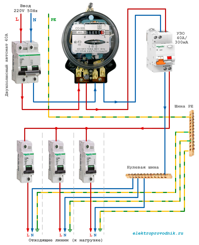 Хоть согласно ПУЭ разделять ноль нужно до счетчика (понимаю с чем связано), я всегда делаю разделение после счетчика и вопросов еще никто не задавал. Чем нравится: если PEN разделять до счетчика, то это пломбируется (либо отдельно либо шкаф учета), доступа к такому контакту нет, а со временем он ослабнет, плюс зажатый одним винтиком на РЕ-шине не очень надежное соединение. Поэтому когда разделение PEN выполнено после счетчика в щитке, всегда есть доступ, можно подтянуть контакт, и PEN-проводник гораздо надежнее зажат в клемах счетчика.