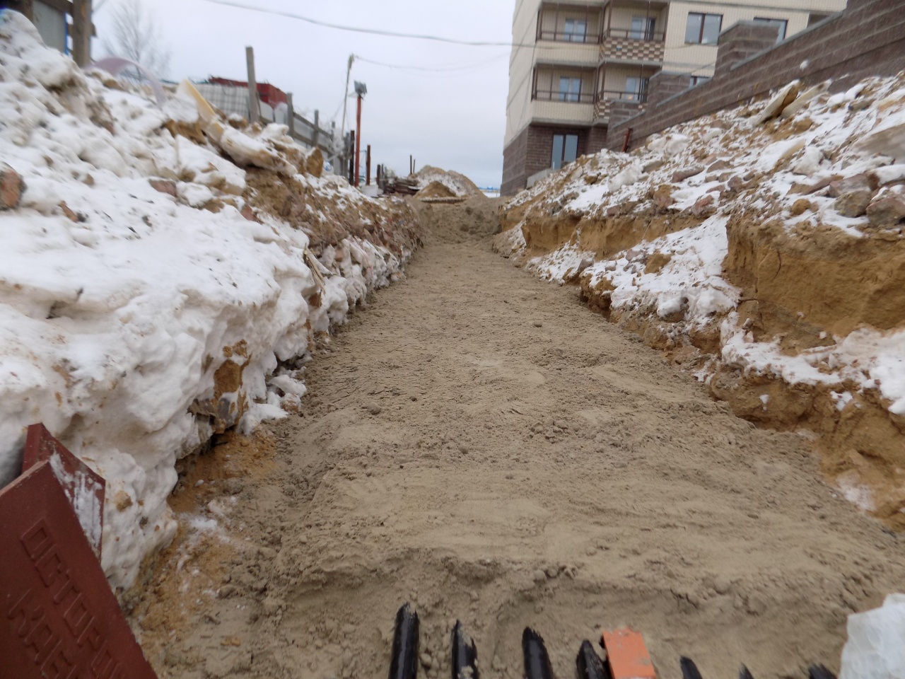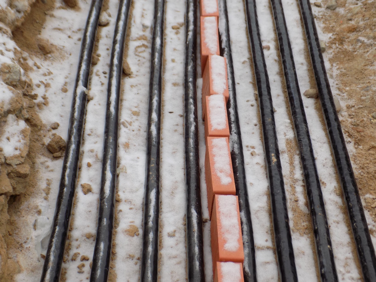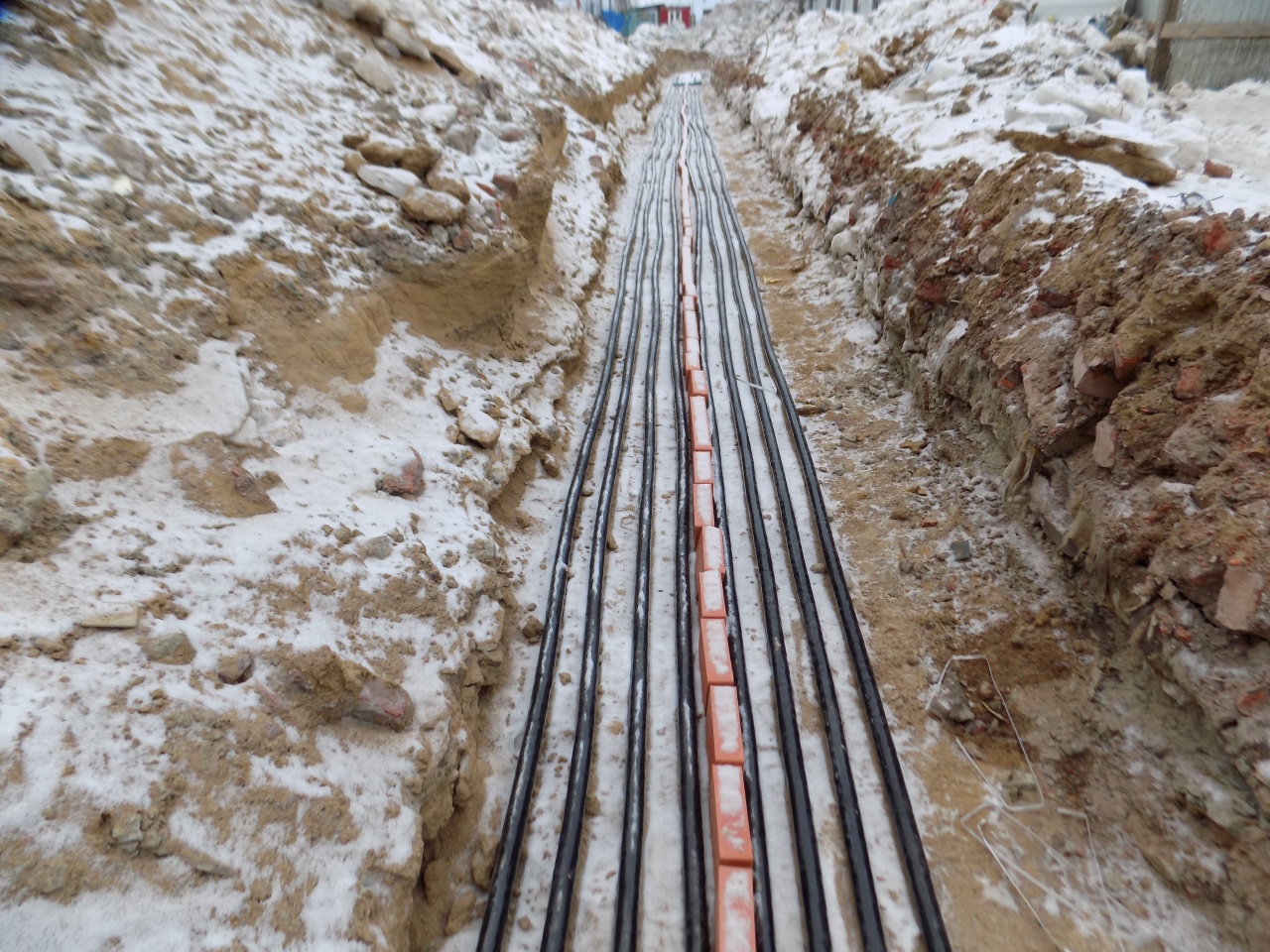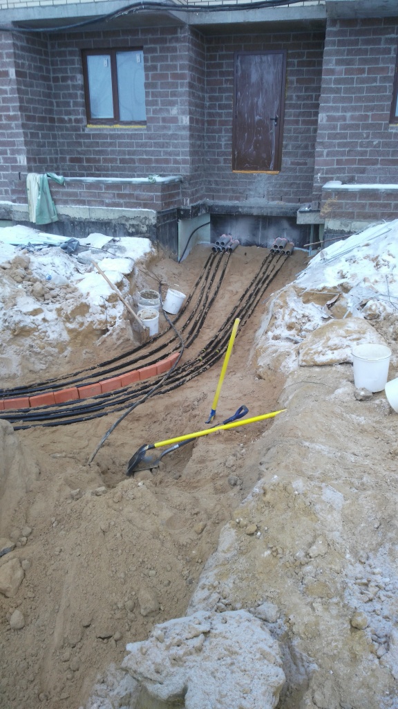 Пример прокладки КЛ 0,4 кВ в траншее от БКТП до двух ГРЩ жилого 20-ти этажного дома (по 4 нитки на каждвй из вводов обеих ГРЩ - всего 16 ниток).